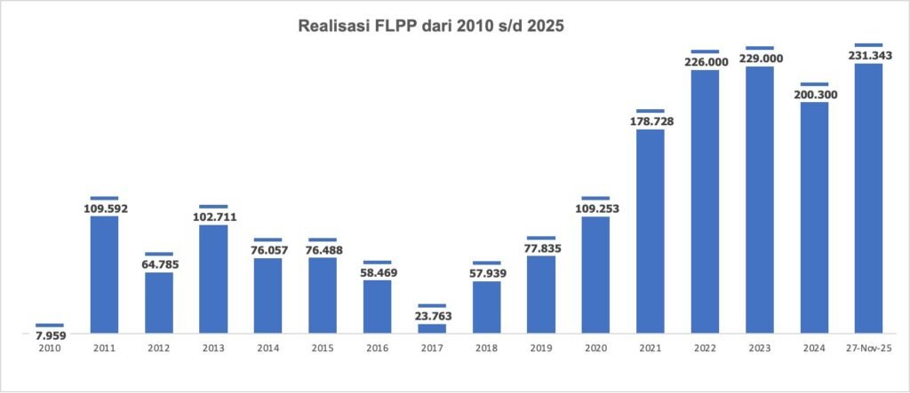 IndonesianForecast, JAKARTA — Badan Pengelola Tabungan Perumahan Rakyat (BP Tapera) telah menyalurkan Fasilitas Likuiditas Pembiayaan Perumahan (FLPP) mencapai 231.343 unit rumah dengan nilai mencapai Rp28,72 triliun hingga akhir November 2025. Angka ini diklaim merupakan yang tertinggi sejak program FLPP diluncurkan pada 2010.
